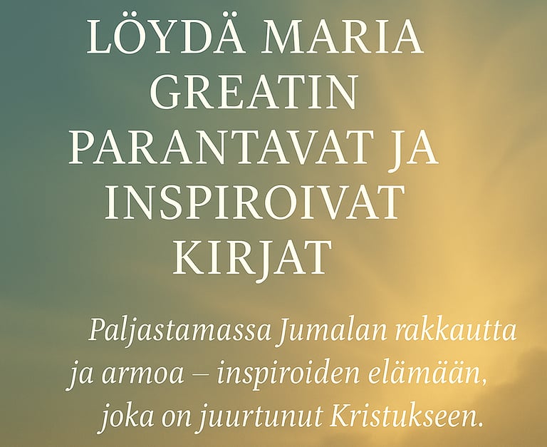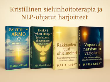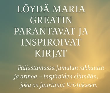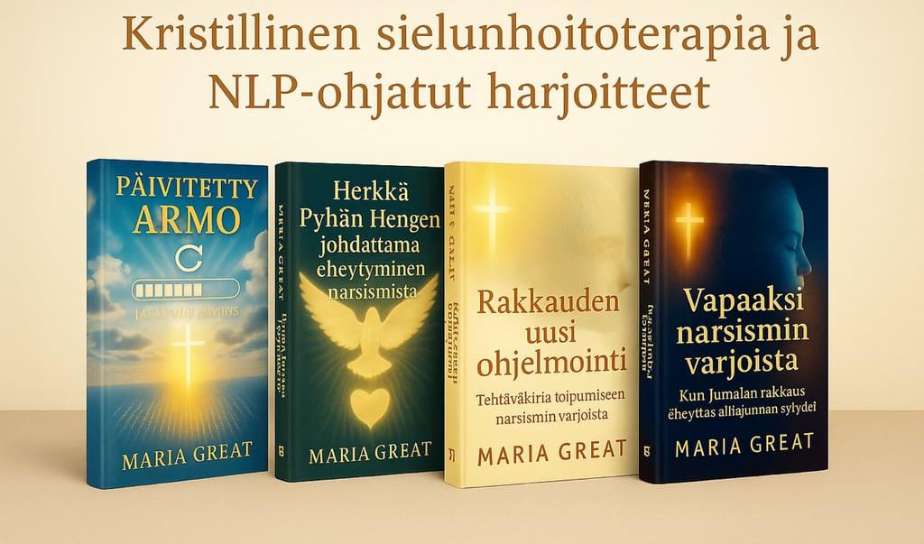 Kirjojeni ja harjoituskirjojen kautta on mahdollista kulkea ohjattu matka – lempeä, mutta syvällinen sisäisen eheytymisen tie, jossa Raamatun sana, rukous ja Pyhän Hengen johdatus muuttavat mielen ja sydämen sisältäpäin.